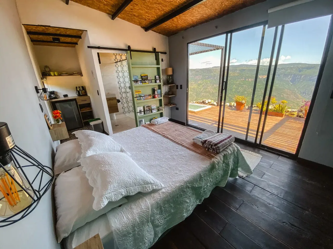 Ubicada sobre el filo del Cañón, ofrece un diseño metálico vanguardista, jacuzzi exterior y una terraza mirador con la “súper vista” del Chicamocha.